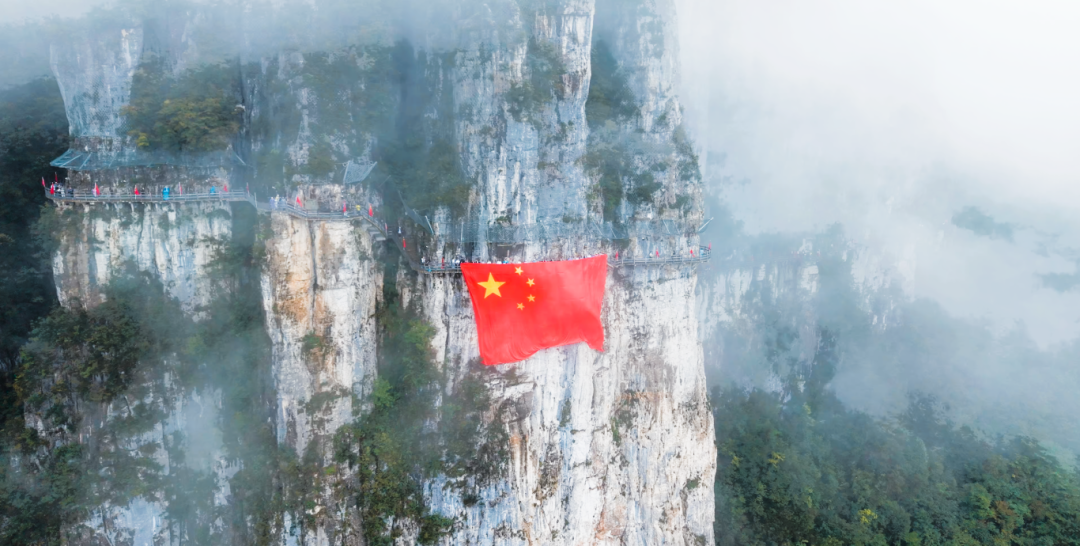 與此同時,七星寨絕壁棧道上,一面巨幅國旗在巍峨絕壁間徐徐展開,這一壯觀景象引得游客紛紛駐足仰望。