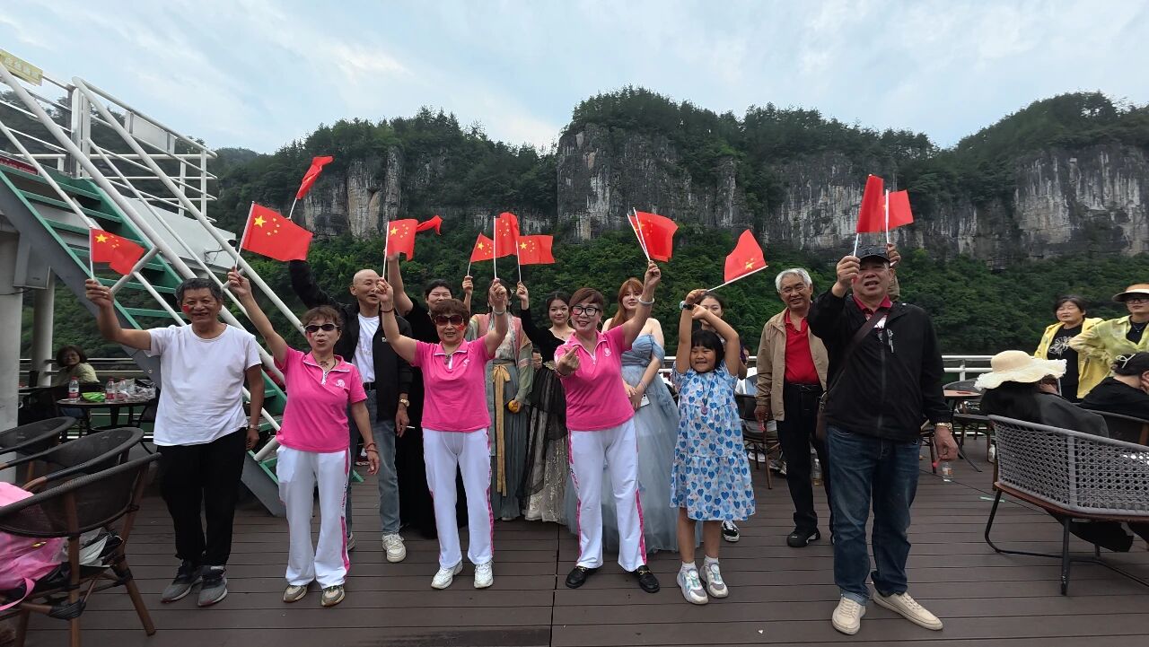 隨后開展的"萬人合聲《我和我的祖國》"活動,引發眾多游客揮動國旗自發跟唱,嘹亮歌聲與峽谷回聲交織,現場氣氛熱烈,游客參與熱情高漲。