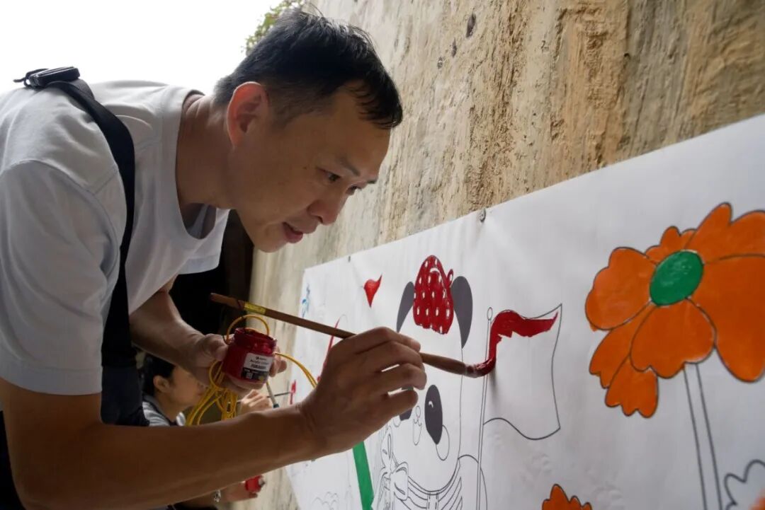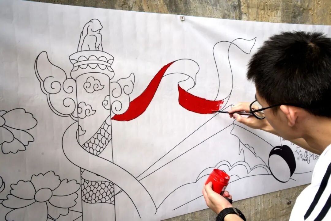 活動現場鋪設的長卷以"錦繡中華"為主題,設置了多個繪畫區域。游客們自發參與創作,或調色勾勒,或細心描繪,共同在長卷上繪制五星紅旗、祥云、火箭等象征國家發展的圖案。