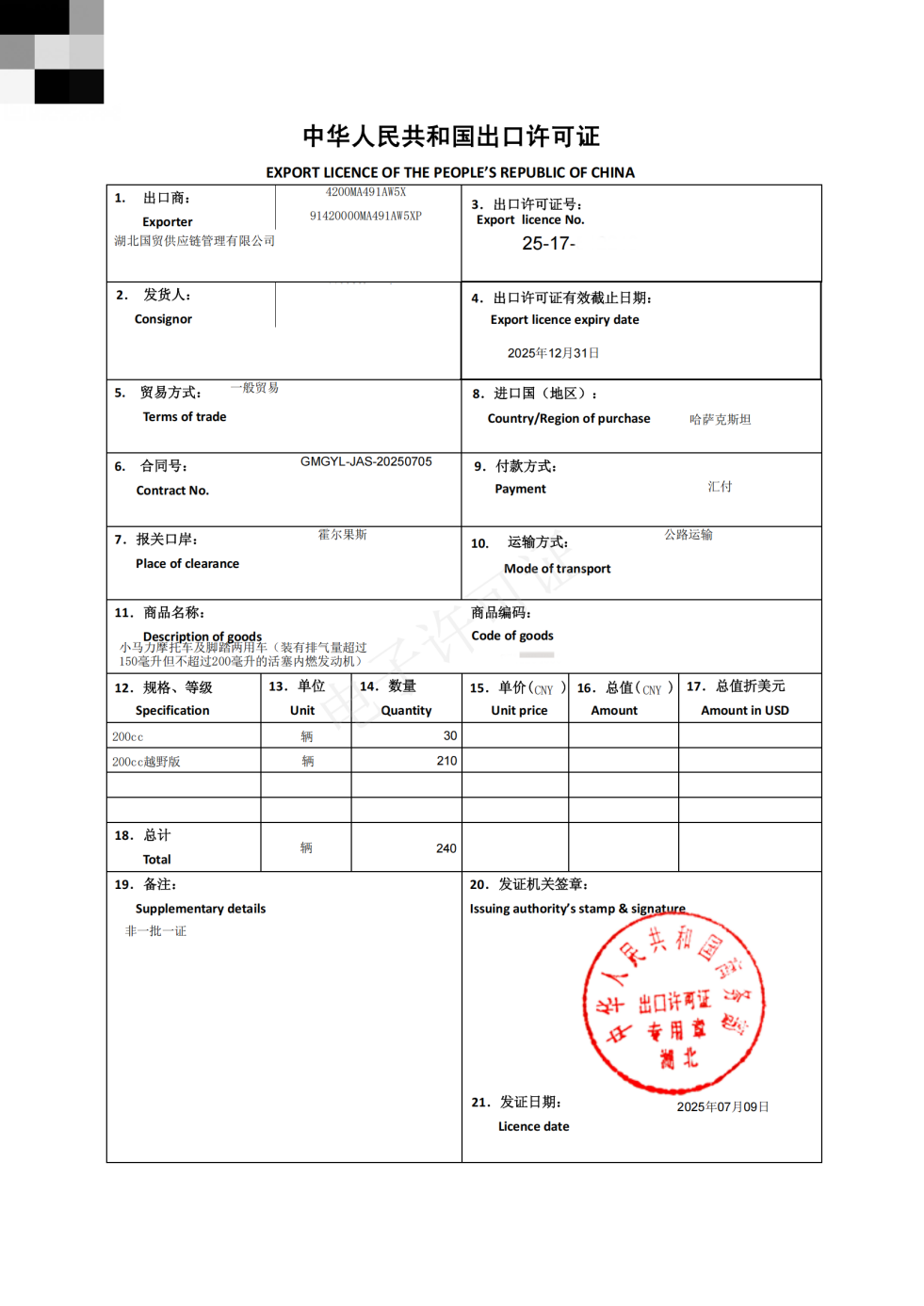 7月20日,湖北國貿(mào)集團旗下國貿(mào)供應(yīng)鏈公司自主運營的首批240臺國產(chǎn)摩托車,經(jīng)霍爾果斯口岸順利通關(guān)并成功運抵哈薩克斯坦阿拉木圖市。這標志著集團在出口領(lǐng)域再次實現(xiàn)突破,全球化供應(yīng)鏈體系建設(shè)邁上新臺階。